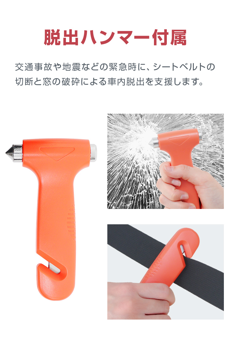 緊急脱出用ハンマーや各種付属品も揃い、車載用としても最適なセット