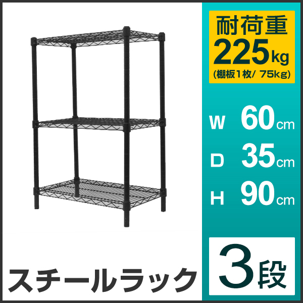スチールラック メタルラック 収納棚 60×35×90cm 3段 耐荷重225kg ぐらつき防止 高さ調節可能 ブラック ラック キッチン 頑丈 シェルフ リビング WEIMALL