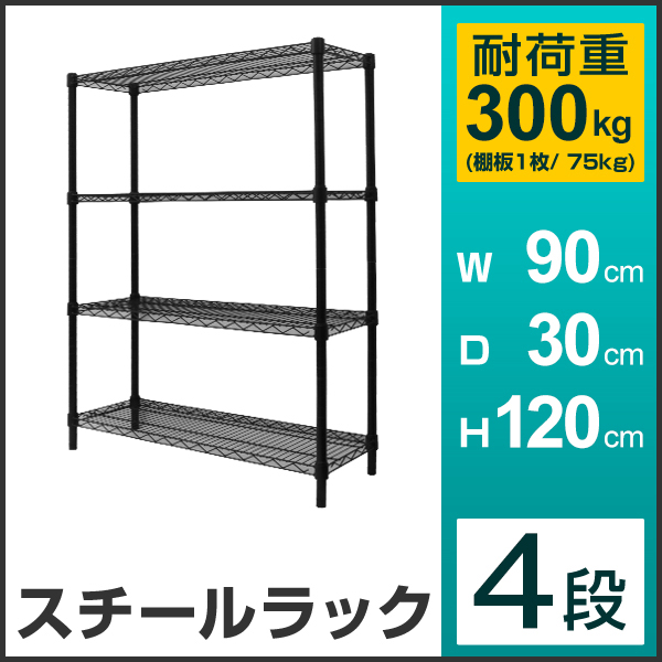 スチールラック メタルラック 幅90 4段 耐荷重300kg ぐらつき防止 90×30×120cm 高さ調節可能 錆びに強い ブラック 収納ラック シェルフ
