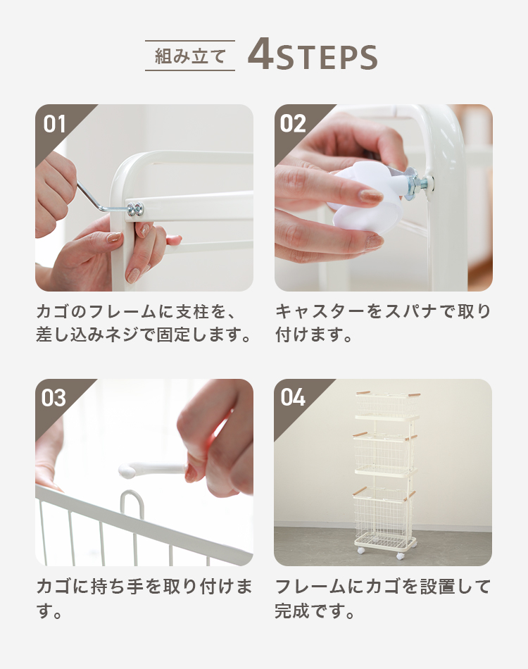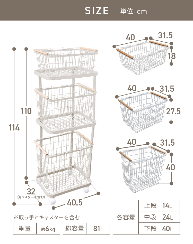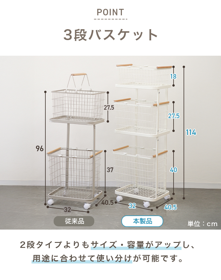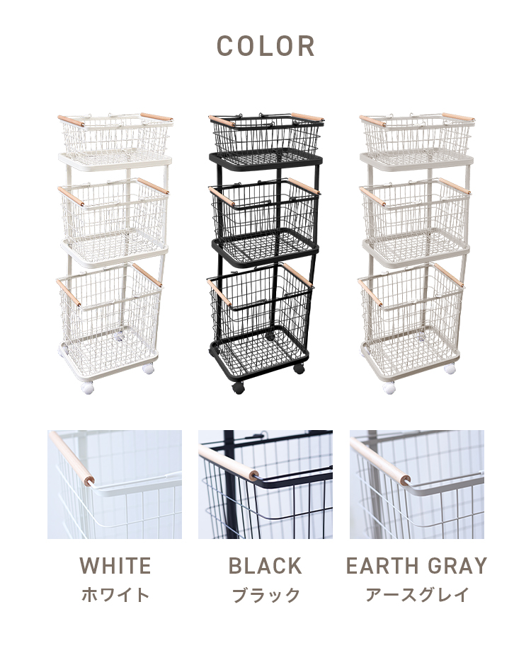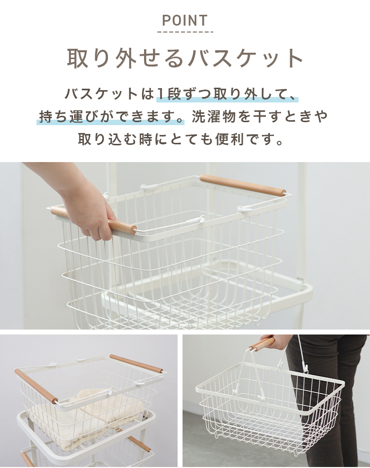 3つのバスケットは各1段ずつ取り外して持ち運びできます。
