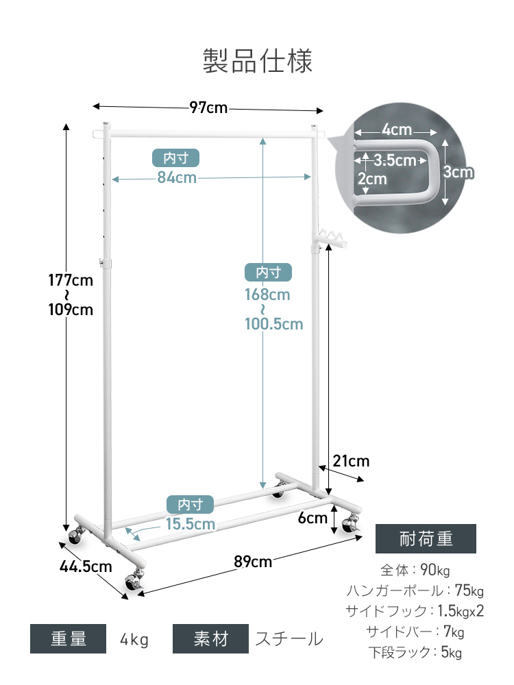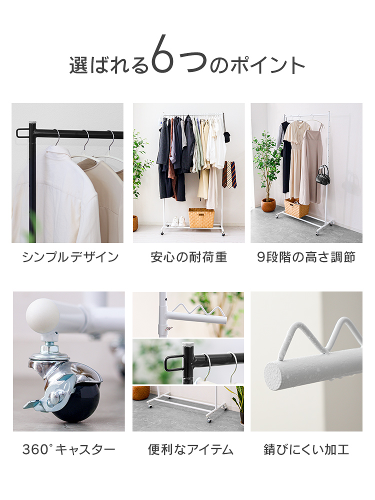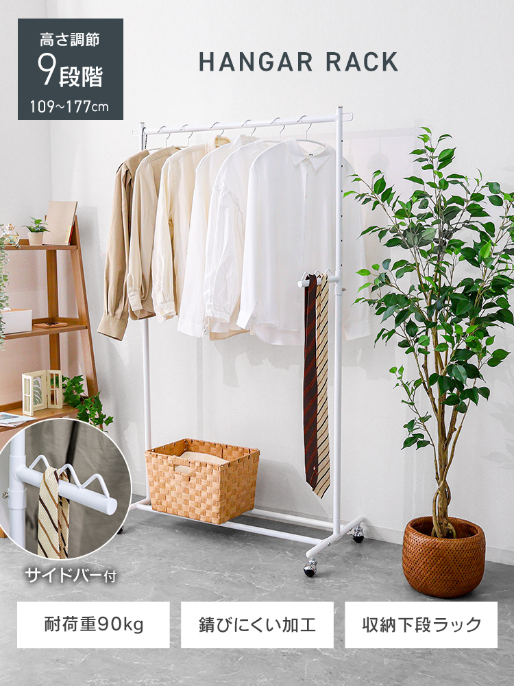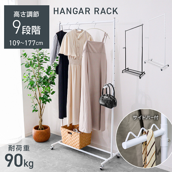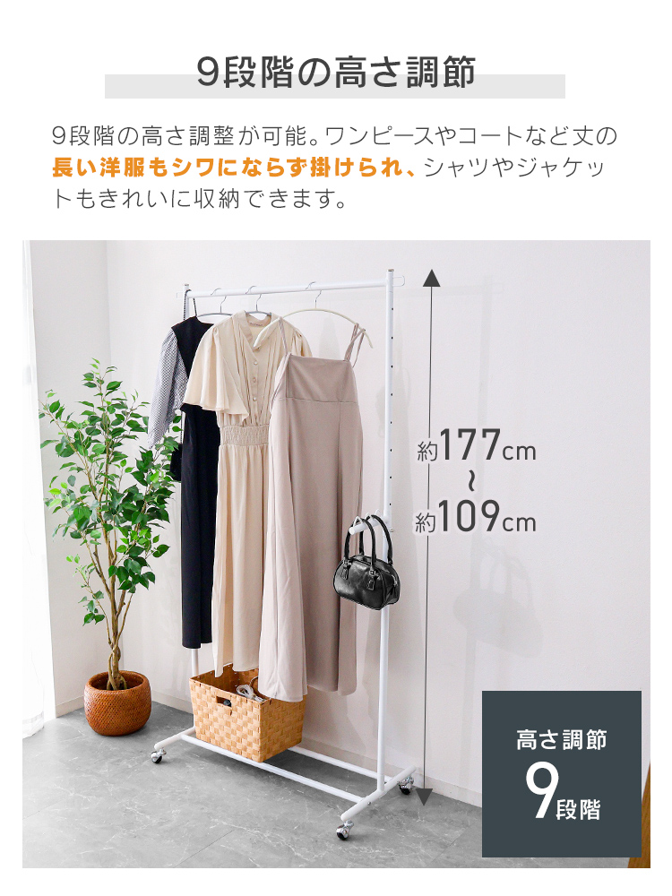 ハンガーラック 頑丈 スリム 幅97cm おしゃれ キャスター付き 高さ109〜177cm 高さ9段階調節 耐荷重90kg 軽量 組み立て簡単