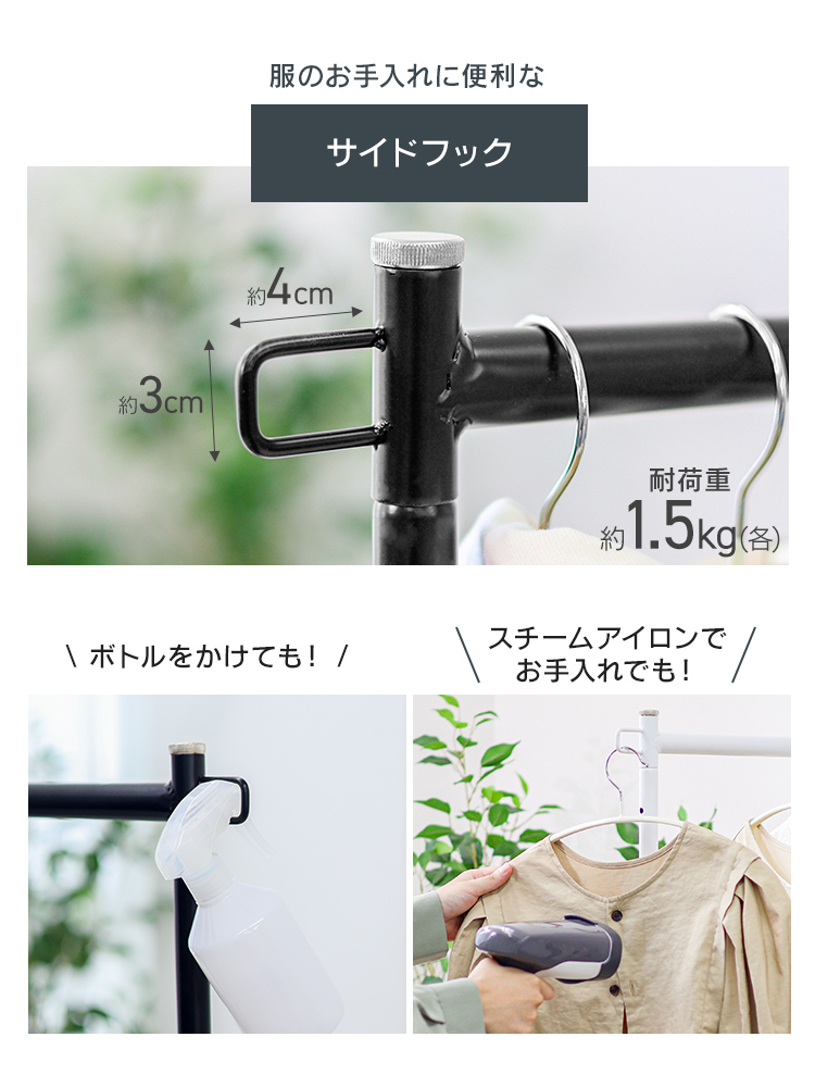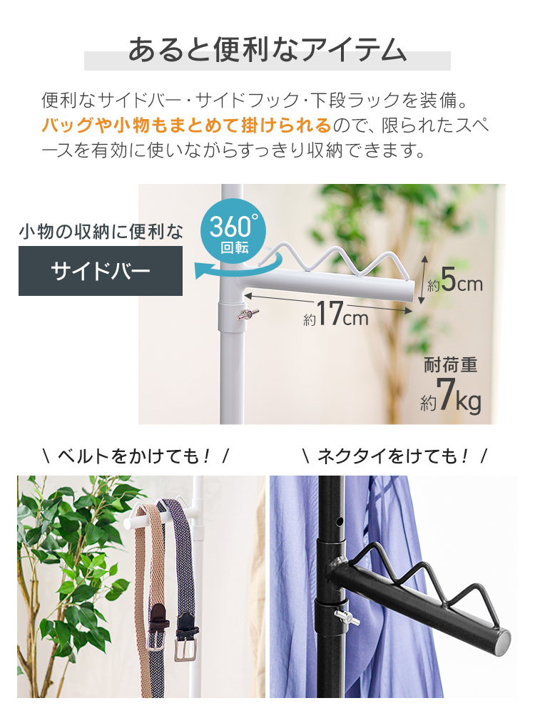 サイドバーは左右どちらにも設置ができてバッグやネクタイ、傘などを掛けることができます。