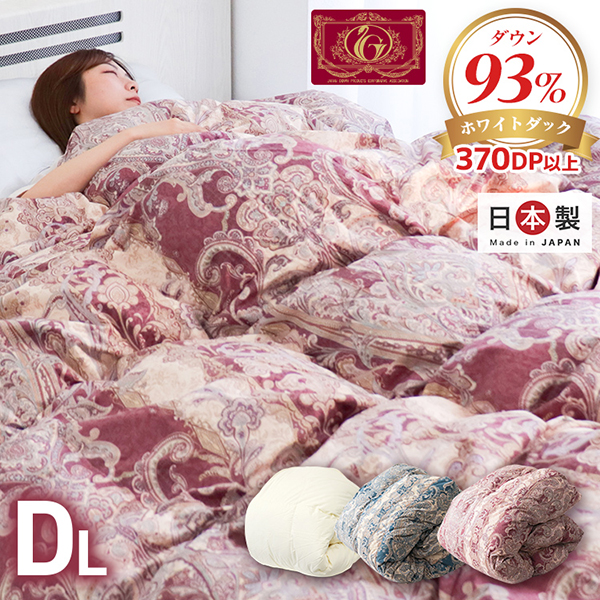 その他仕様:日本製、ダウンパワー370dp以上、抗菌防臭・防ダニ加工、立体キルト加工、トリセット加工、ダイヤモンド起毛加工、国内パワーアップ加工(高温高圧加熱加工)、超軽量TTC生地を使用、二重縫製、布団留めループ 8箇所付き