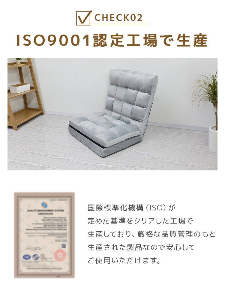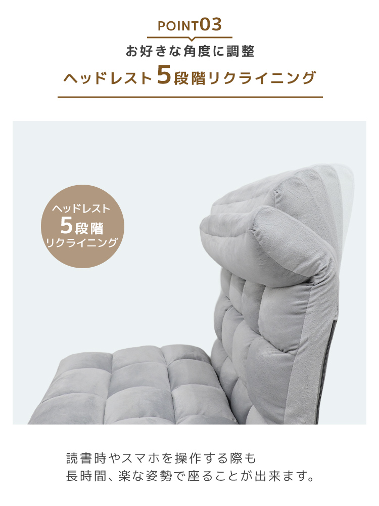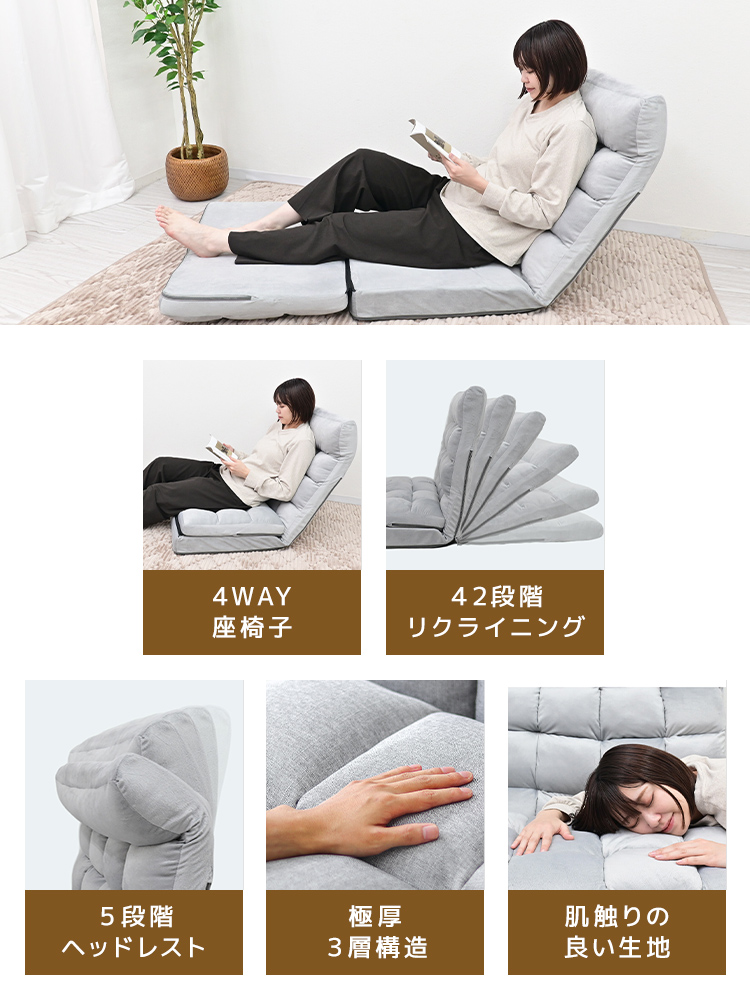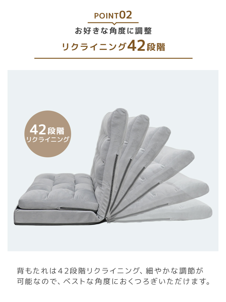 背もたれには日本製42段階リクライニングギアを搭載し、読書・テレビ鑑賞・昼寝・在宅ワークなどに合わせて細やかな角度調整が可能。