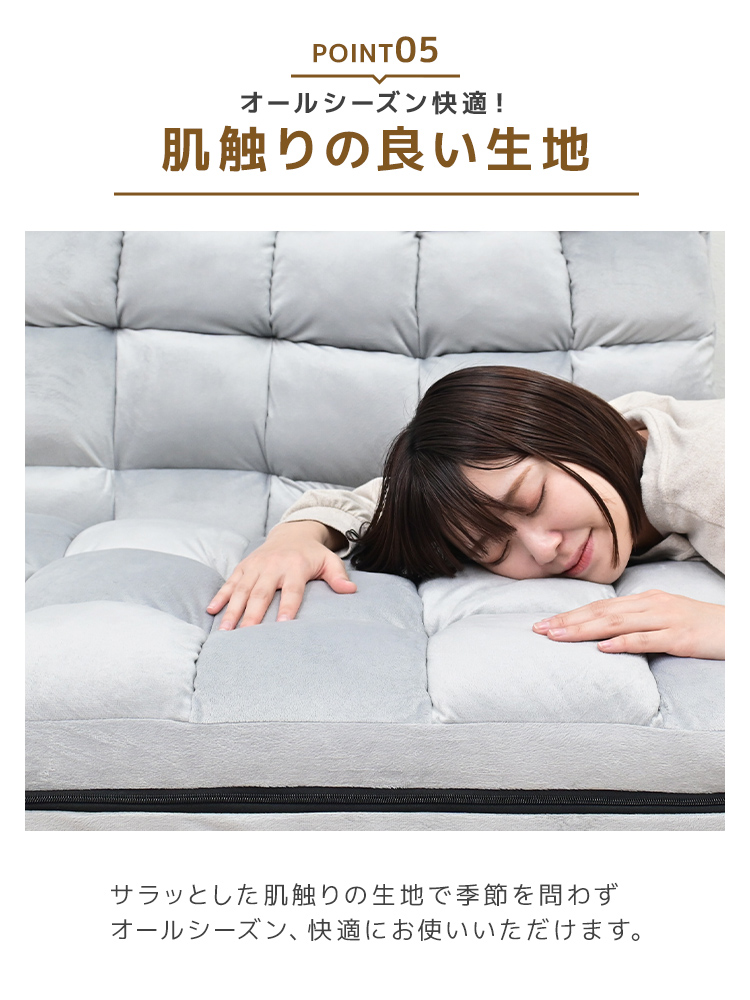 張地はポリエステル100%のファブリック生地とマイヤー生地でさらりとした手触りを実現し、季節を問わず快適に使用可能。