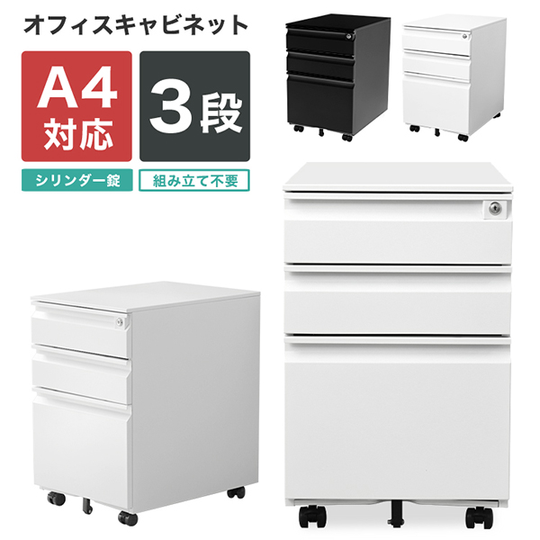 デスクワゴン サイドワゴン キャスター付き 鍵付き 3段 スリム 完成品 デスク キャビネット オフィスワゴン 袖机 小型キャビネット オールロック A4サイズ