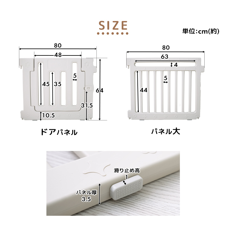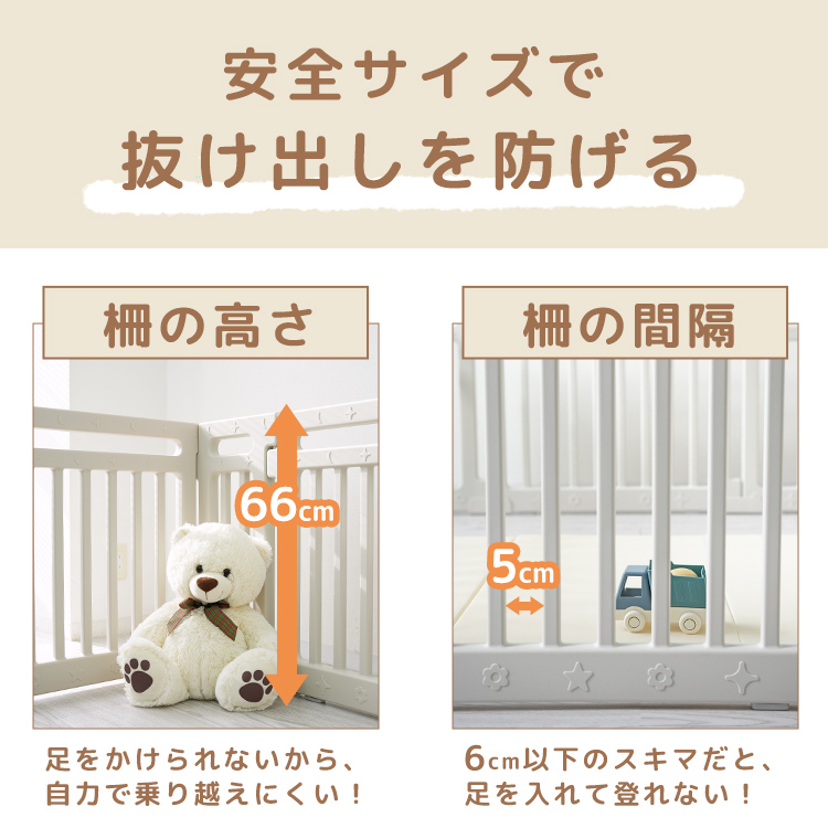 高さ約66cmのハイタイプ仕様で、つかまり立ちやつたい歩きを始めたお子さまが乗り越えにくく、しっかりガードします。