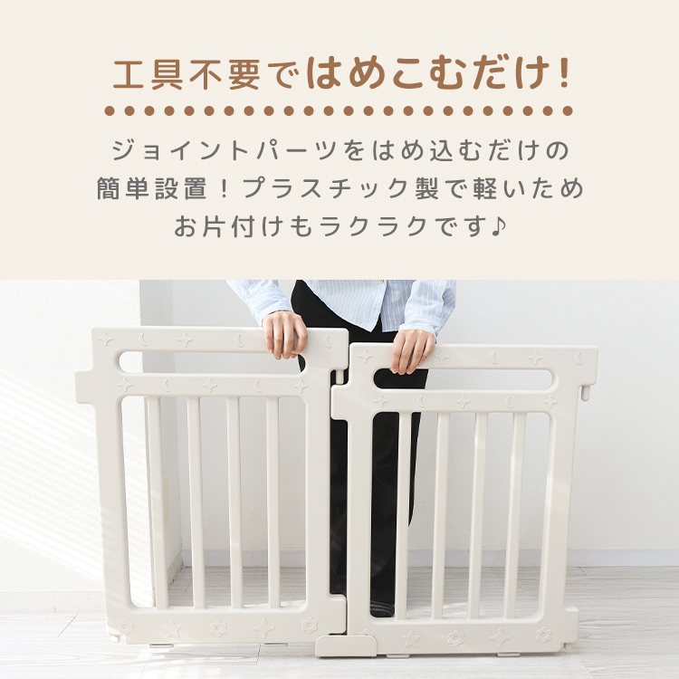 パネルの角度や配置は自由に調整でき、お部屋の形やスペースに合わせて好きなサイズのサークルを作れるのが特長です。