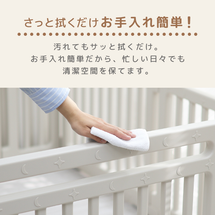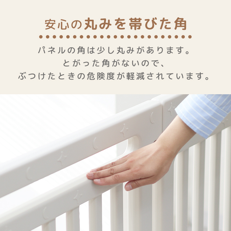 柵の間隔は広めで、手足や指を挟みにくい構造なので、元気に動き回る赤ちゃんにもぴったりです。