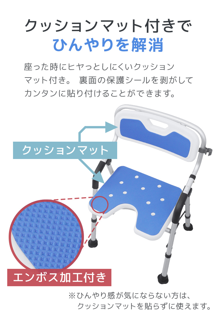 座面と背もたれにはやわらかいクッションマットを備え、冷たい浴室でも快適な座り心地を実現。