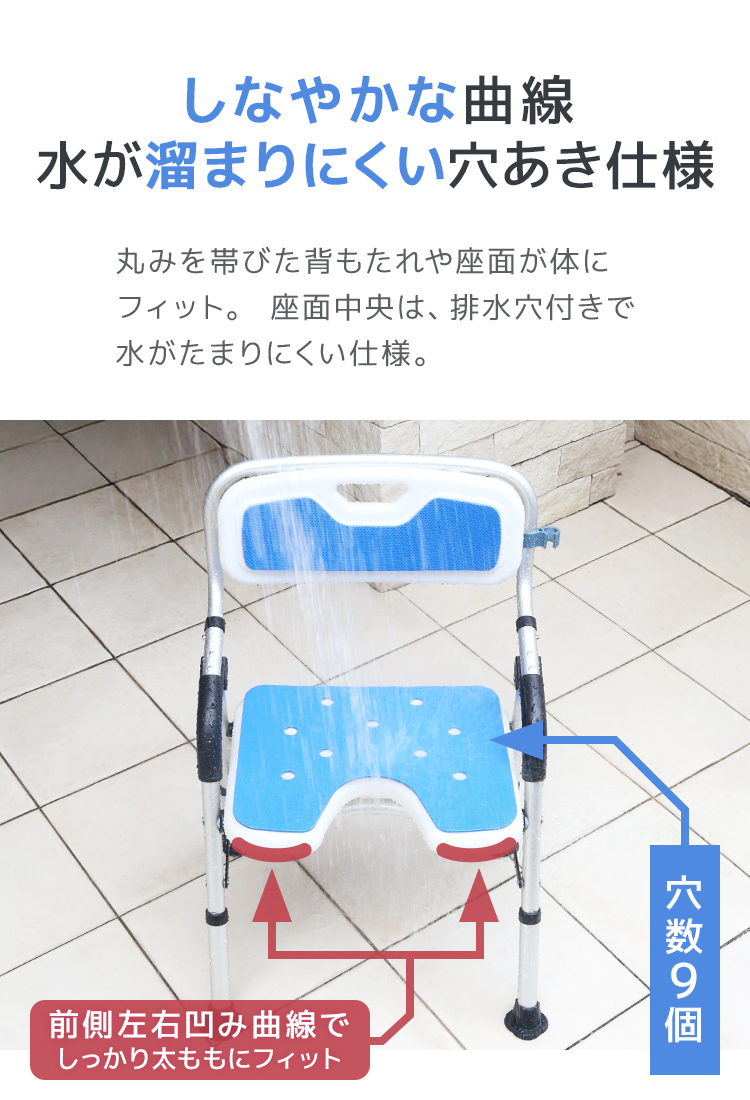座面はU字溝形状で局部やおしりを座ったまま洗え、立ち上がり回数を減らし転倒リスクを軽減。