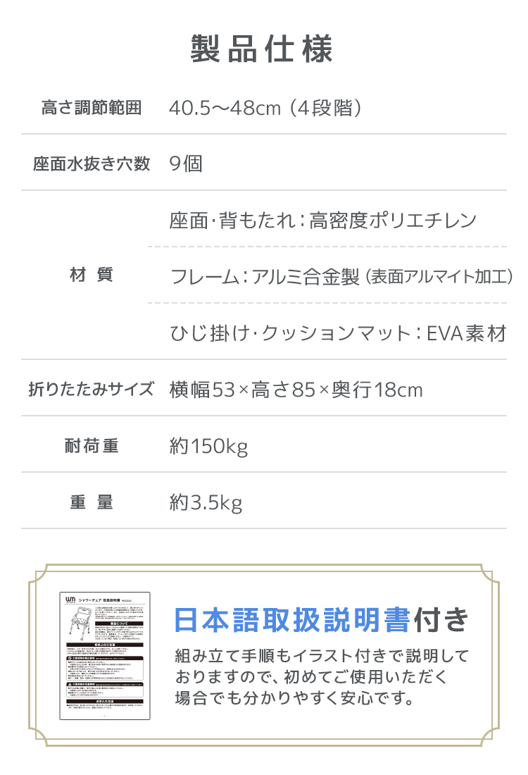 シャワーチェア 介護用 折りたたみ U型座面 肘掛け付き クッションマット 高齢者 妊婦 入浴用風呂椅子 転倒防止 耐荷重150kg
