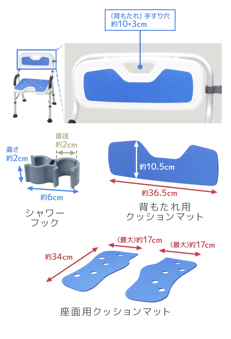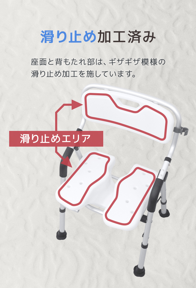 両側に肘掛けがあり、立ち座りをしっかり支えて転倒リスクを軽減。背もたれ付きで長時間座っても姿勢が安定し、介助者も安心して入浴補助ができます。