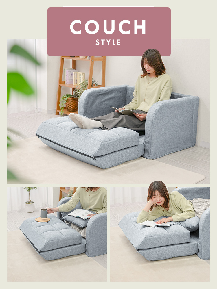 「ソファ」「カウチ」「ベッド」「セパレート」の4通りのスタイルに切り替えられるので、くつろぎたい時もゆったり休みたい時も、その時に一番心地よい姿勢でお使いいただけます。