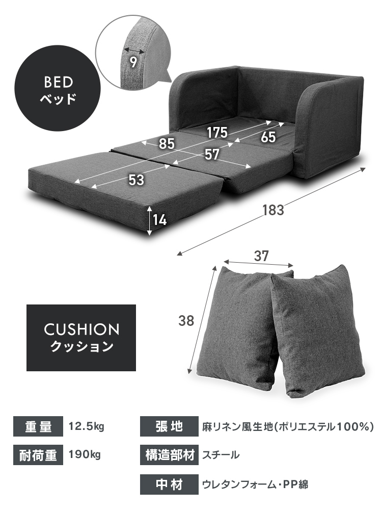 素材:麻リネン風生地(ポリエステル100%)、スチール、ウレタンフォーム・PP綿