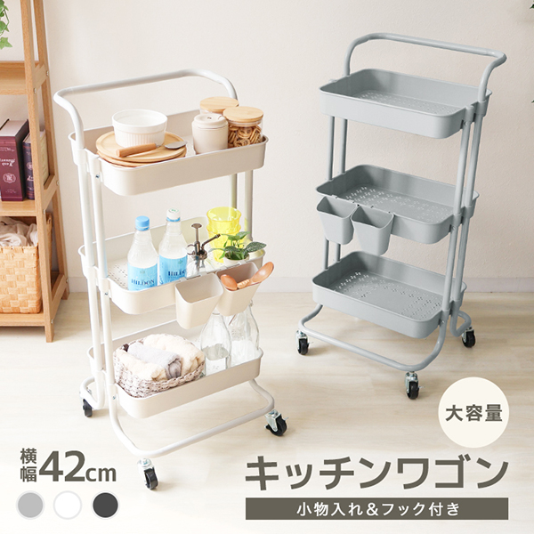 キッチンワゴン キャスター付き ワゴン キッチンワゴン スリム 3段 高さ調節 取っ手付き ハンドル キッチン収納 キッチン 作業台 リビング 軽量 小物入れ フック