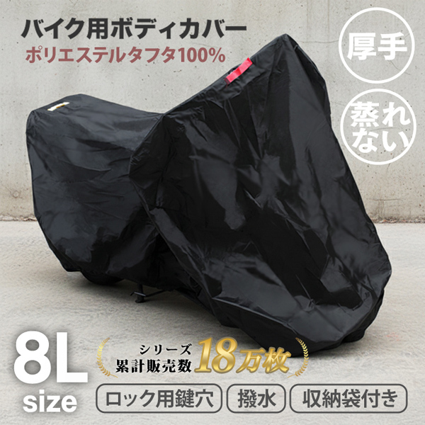 バイクカバー 8Lサイズ 紫外線 強風 耐熱 バイクカバー 断熱 黒 収納袋付 蒸れない 高品質 鍵穴 ロック用鍵穴 ワンタッチ 取っ手 大きめ