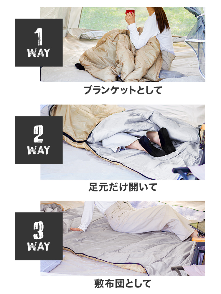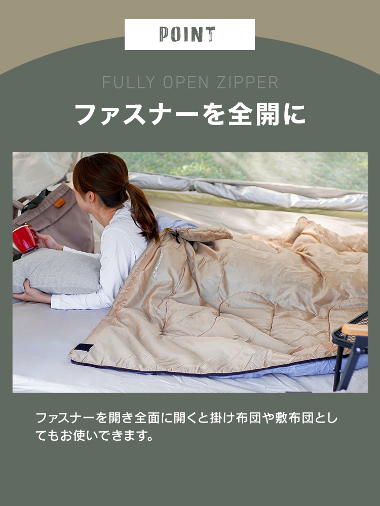 封筒型&ダブルジッパー仕様で足元から開閉でき、温度調整も簡単です。