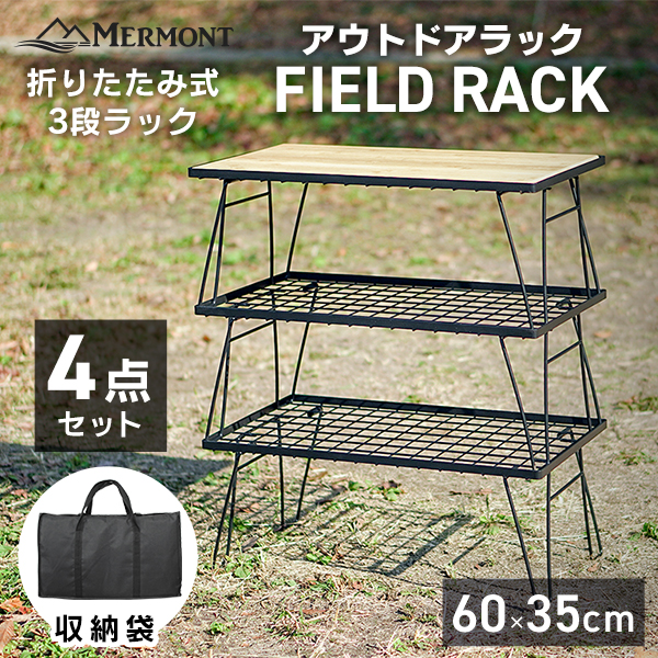 アウトドアテーブル フィールドラック 3段ラック 4点セット キャンプテーブル 折りたたみ 天板付き 収納袋 キャンピングラック キャンプ メッシュテーブル