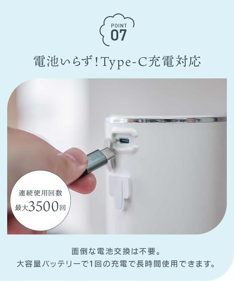 さらに壁掛け対応で設置場所を選ばず、Type-C充電式で電池不要で使えます。