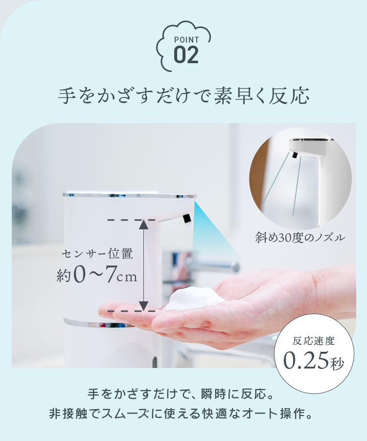 ノズルが斜めに設計されているため、飛び散りを防ぎ、衛生的にお使いいただけます。