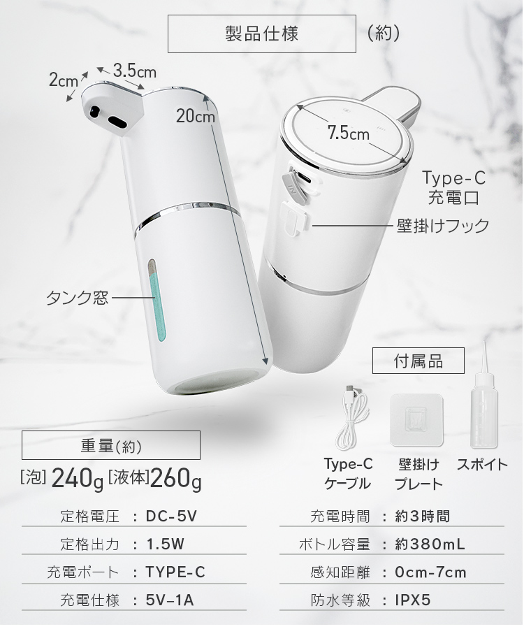 付属品:Type-Cケーブル、壁掛けプレート、スポイト