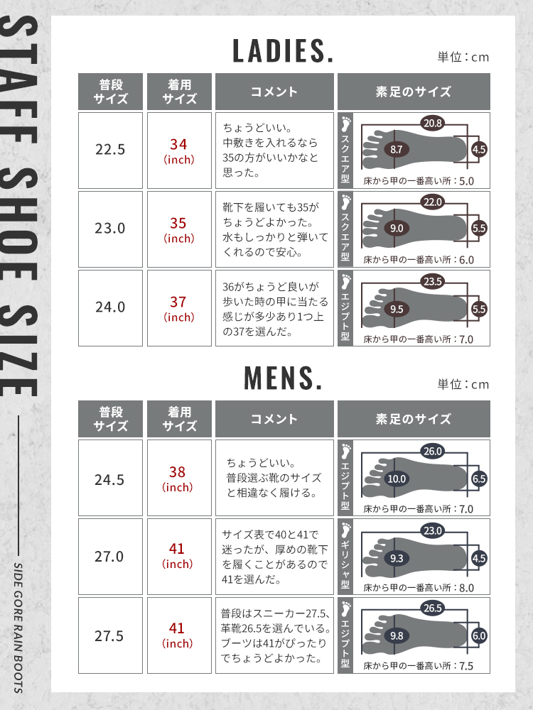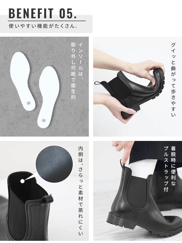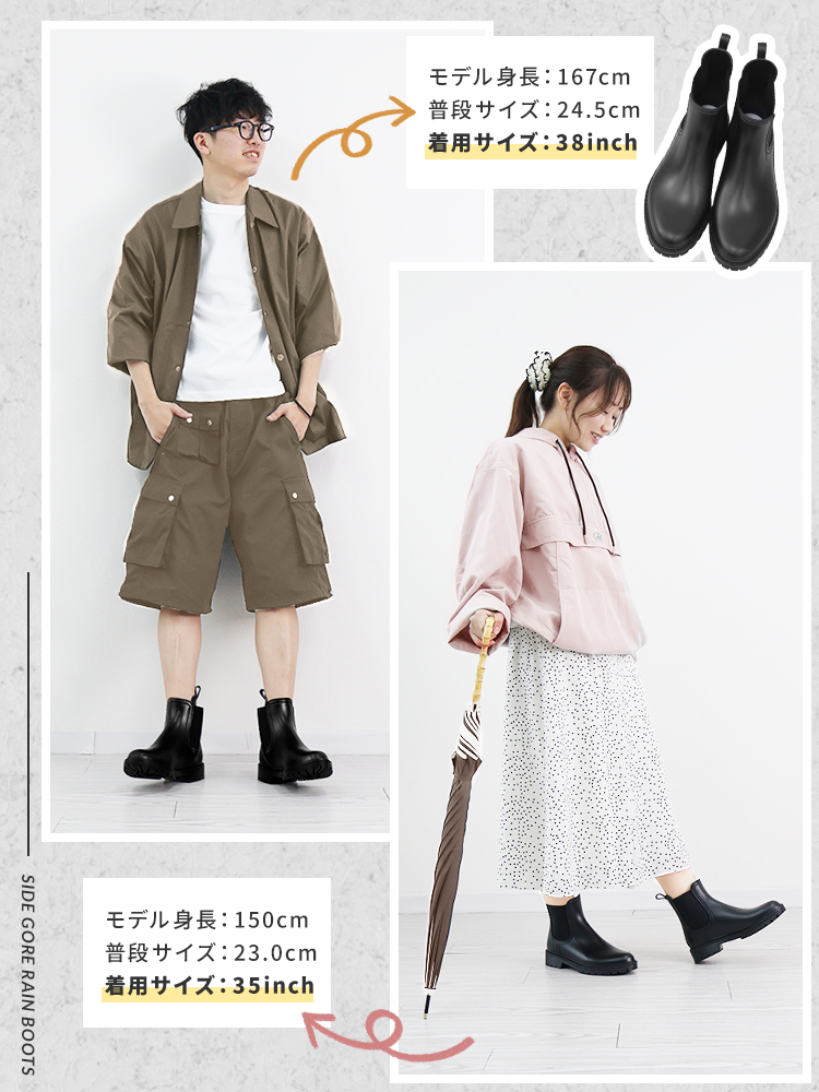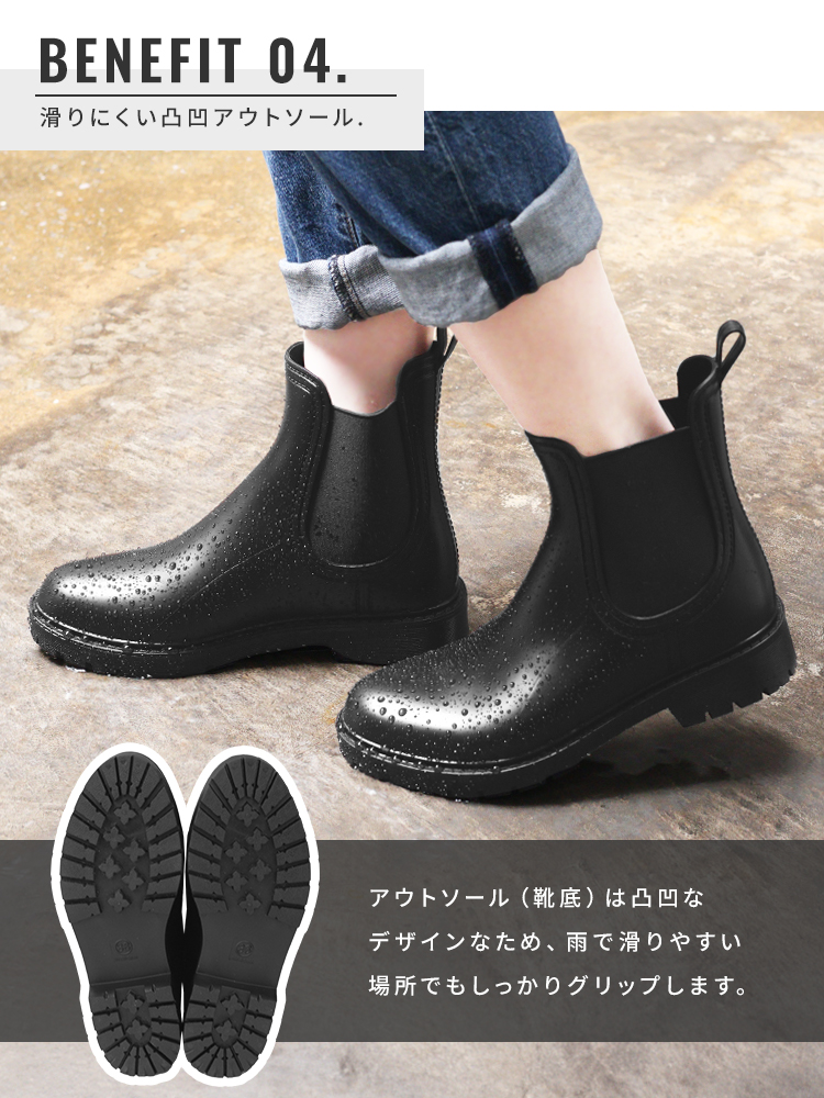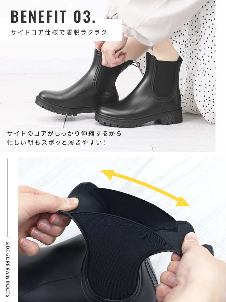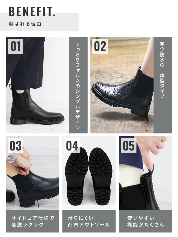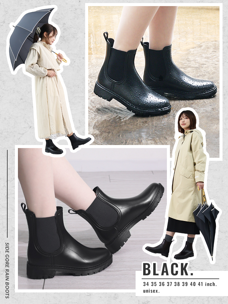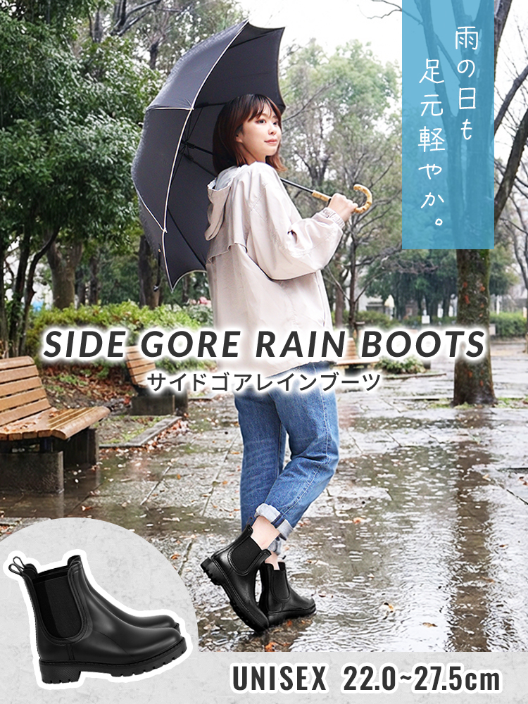 そんな方にぴったりな、スタイルを選ばず履ける、すっきりシルエットのサイドゴアレインシューズ。