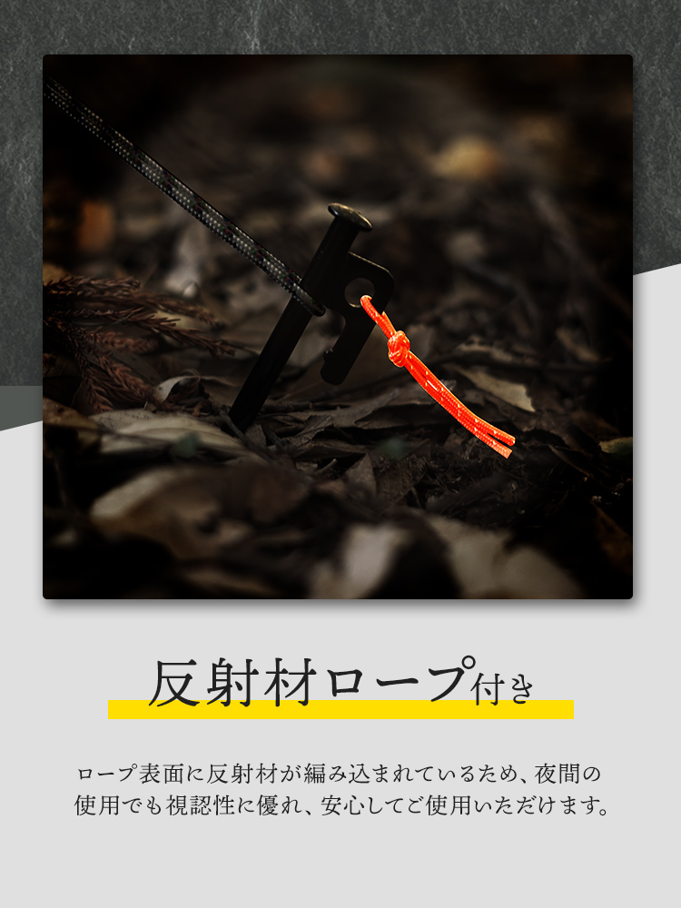 ペグに付属のロープは反射材がついているため、夜間もペグの回収忘れを防止します。