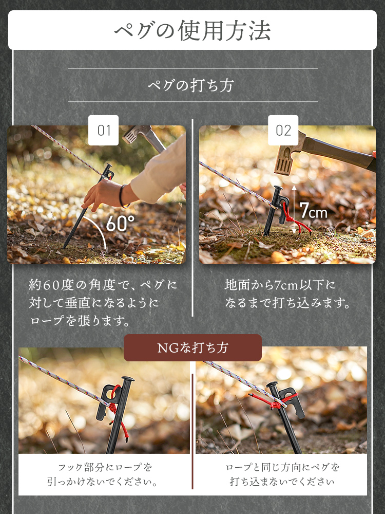 硬い地面にも貫通し、安心してアウトドアをお楽しみいただけます。