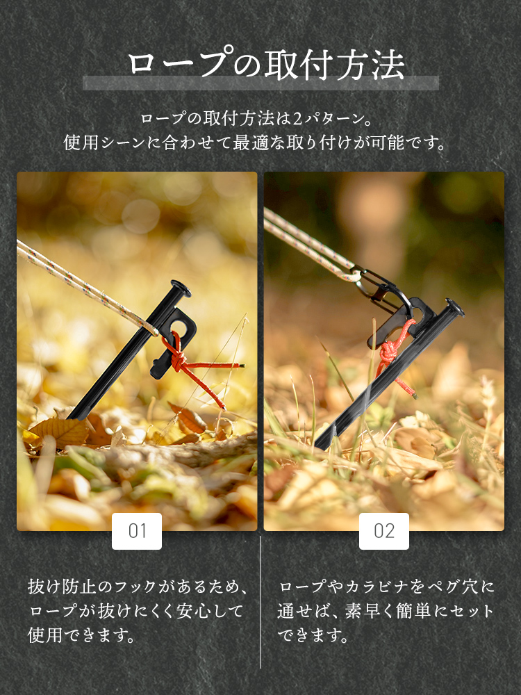 スチール製のペグは抜群の強度と硬度を持ち、曲がりにくく折れにくい!