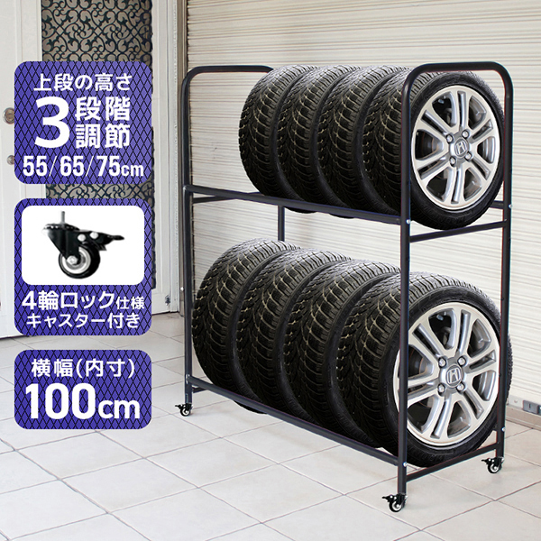 タイヤラック タイヤスタンド 耐荷重300kg 収納 保管 タイヤ収納 スリムタイプ キャスター付 組み立て式 高さ調節 3段階 8本 スチール ロック機能