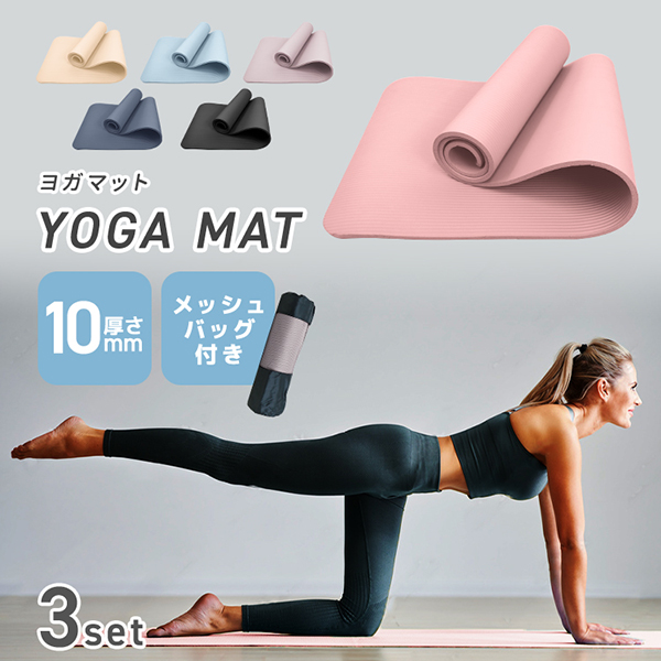 ヨガマット 10mm 3本セット 厚手 幅広 ケース 収納ケース付き ストレッチ 滑らない ストレッチマット 防音 衝撃吸収 ピラティス ホットヨガ トレーニング