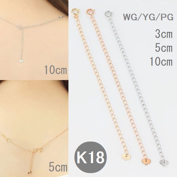 K18(18金)素材、アジャスターチェーン、3cm、5cm、10cm、ホワイトゴールド、イエローゴールド、ピンクゴールド、日本製。