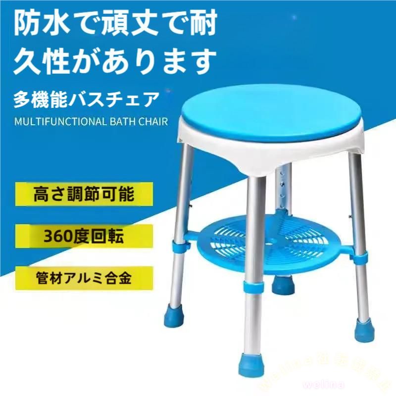 防水シャワーチェア 収納ラック付き 360度回転 高さ調節 Welina アルミフレーム 滑り止め お風呂椅子 入浴サポート 多目的