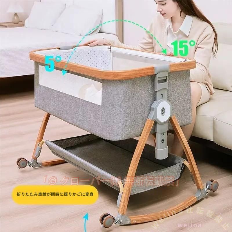 高さ多段調節高さ6段階調節可能で、各高度の大人ベッドにくっつけてご利用可能です。静音式のボタン設計で、自由に高さ調節し、お子様は振動を感じしなく、驚かないです。ベッドは少し傾き、新生児に対してミルクの吐くことを防ぐことができます。