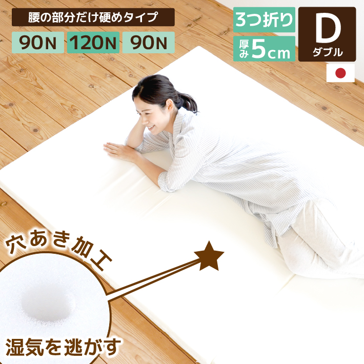 マットレス ダブル マットレストッパー 三つ折り 3つ折り 折りたたみマットレス 日本製 厚さ 5cm 腰部分 硬め 穴あけ加工 逃湿バランスD 爆買
