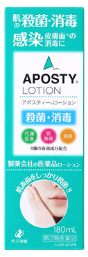 アポスティーローションは、健康な皮膚を取り戻すためにお使いいただく使用感の良い殺菌消毒ローション剤です。