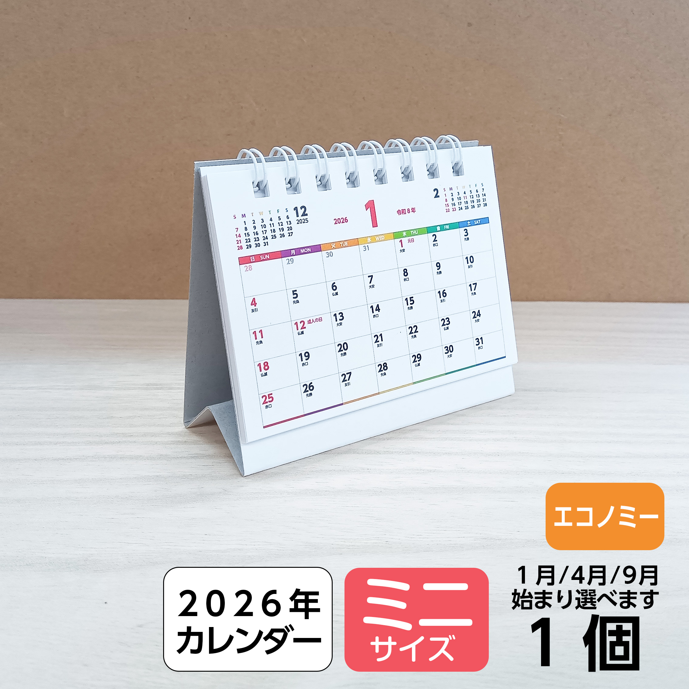 卓上カレンダー ミニ |2026年 低価格 小さい コンパクト モニター下 リングタイプ 六曜 1ヶ月 (小ロット 袋入れ 個包装)(選択 1月 4月 始まり) 1個