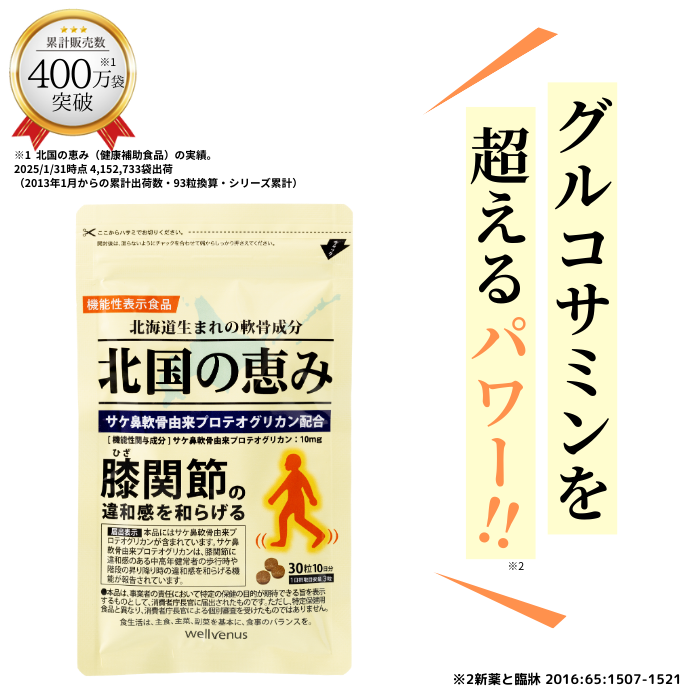 | 商品区分 | 機能性表示食品 機能性届出表示:北国の恵みは、サケ鼻軟骨由来プロテオグリカンを配合した機能性表示食品です。 本品にはサケ鼻軟骨由来プロテオグリカンが含まれています。サケ鼻軟骨由来プロテオグリカンは、膝関節に違和感のある中高年健常者の歩行時や階段の昇り降り時の違和感を和らげる機能が報告されています。(届出番号:I904) |