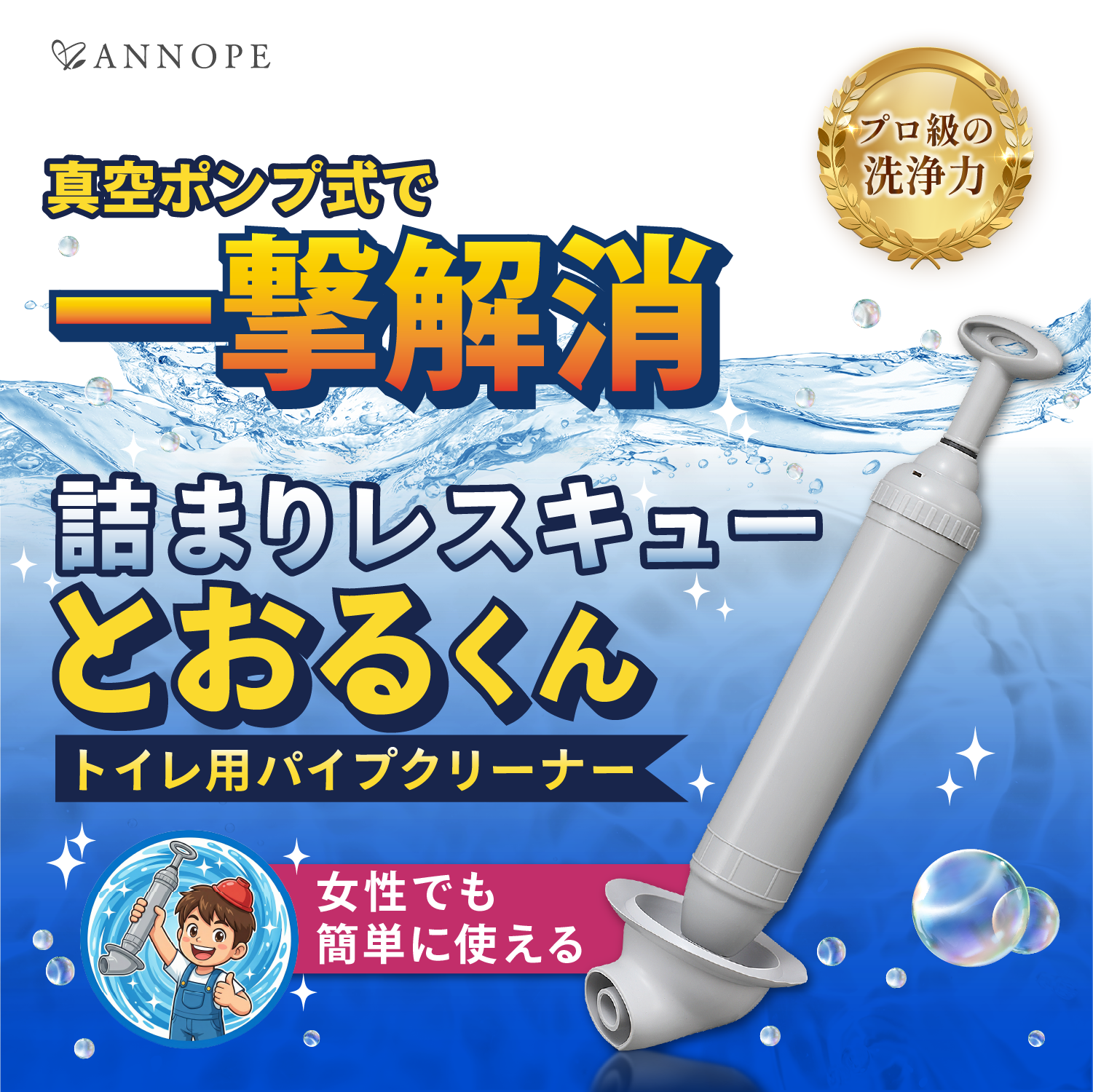 ラバーカップ トイレ 詰まり すっぽん パイプクリーナー 真空式 詰まり解消 真空ポンプ式 詰まりレスキュー とおるくん ANNOPE