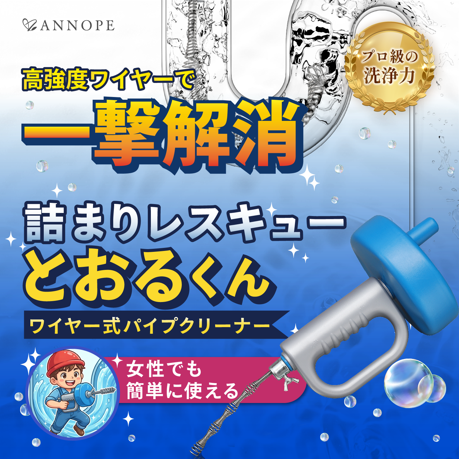 【業者レベルの高強度ワイヤーで一気に解消】独自設計による高強度 ワイヤー を採用しているため、 パイプ詰まり をラクラク貫通できます。