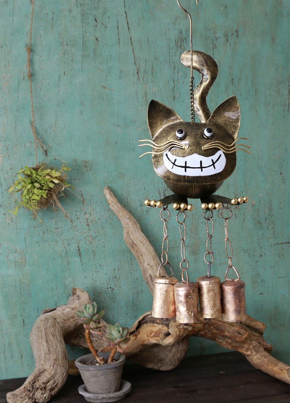 手作り感のある色合いが魅力的なネコのブリキ製ベルです。ニカッと笑う表情と曲がったおヒゲがとってもキュート!