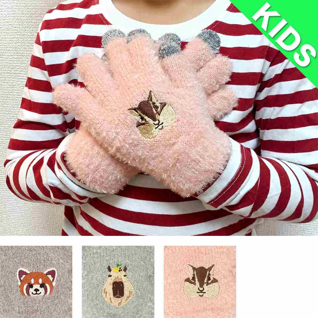 キュートな刺繍のもふもふスマホ手袋のキッズサイズ
