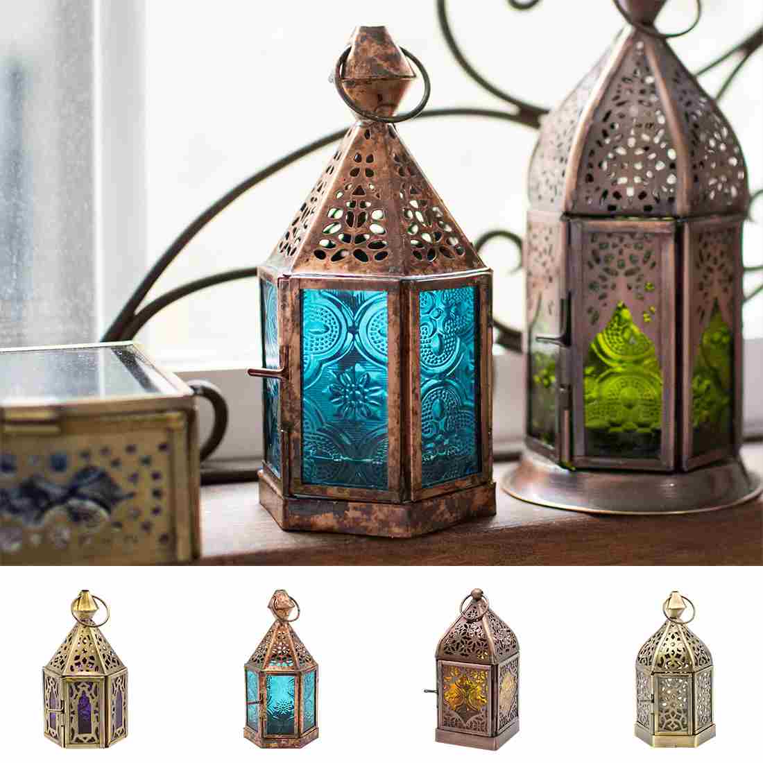 <br>繊細な透かし柄と色鮮やかなレリーフガラスが美しいモロッカンキャンドルホルダー。