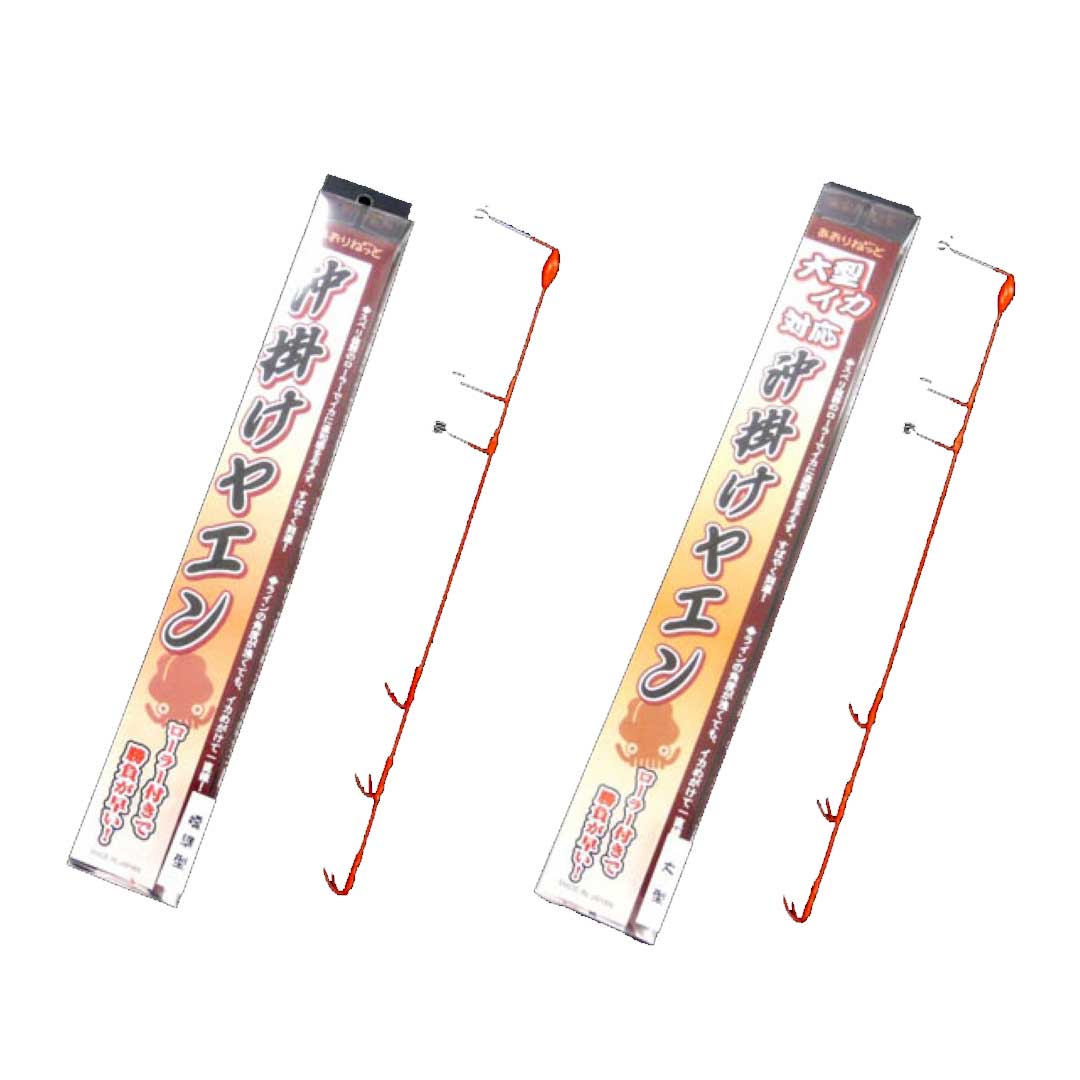 あおりねっとオリジナルの「ヤエンローラー」を搭載!距離があっても角度がなくても、アオリイカめがけて一直線です。スベリ抜群のローラーでアオリイカに違和感を与えず、すばやく到達します。●アオリイカまで到達すれば針がフッキングしやすい「前軽量・後ろ重心」型です。●螺旋型 → ヤエンローラー → ワンタッチ型 の3点支点です。●超軽量の重量設定です。●ランダムに並んだカエシ付き大型針です。●視認性の良いオレンジ色です。寄せる前に掛けバラシを少なくする「沖掛け」がコンセプトのヤエンです。※この「沖掛けヤエン」に跳ね上げ機構を持たせているヤエンが「フッカーヤエン」になります。標準型と軽量型の2サイズがあります。<標準型>■全長:約35cm■第一支点から針先までの長さ:約22.5cm■重量:約12g■針数:3セット■対象:500g〜2kgのアオリイカ■カラー:オレンジ<大型>■全長:約39cm■第一支点から針先までの長さ:約18.5cm■重量:約15g■針数:3セット■対象:2kg前後以上の大型アオリイカ■カラー:オレンジ