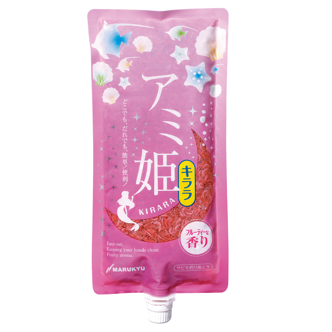 アジが好むとも言われる赤色を強くし、水中でも目立つ“キララ”を配合したサビキ釣り用配合エサです。しっかりしたアミエビの粒とキラキラ光る“キララ”が水中でアピール力を発揮。多くの魚を集め、足止め効果も期待できます。アミエビの独特なにおいをフルーティーな香りでマスキングしておりますので、アミエビの生臭さが苦手な方も安心してお使いいただけます。常温製品で、解凍する手間がなくそのまま使用が可能です。持ち運びもキャップ付きのため簡単です。「アミ姫」同様に手を汚さずにしぼり出すことができ、気軽にサビキ釣りがお楽しみいただけます。使い方はキャップを開けて、サビキカゴに注入するだけです。