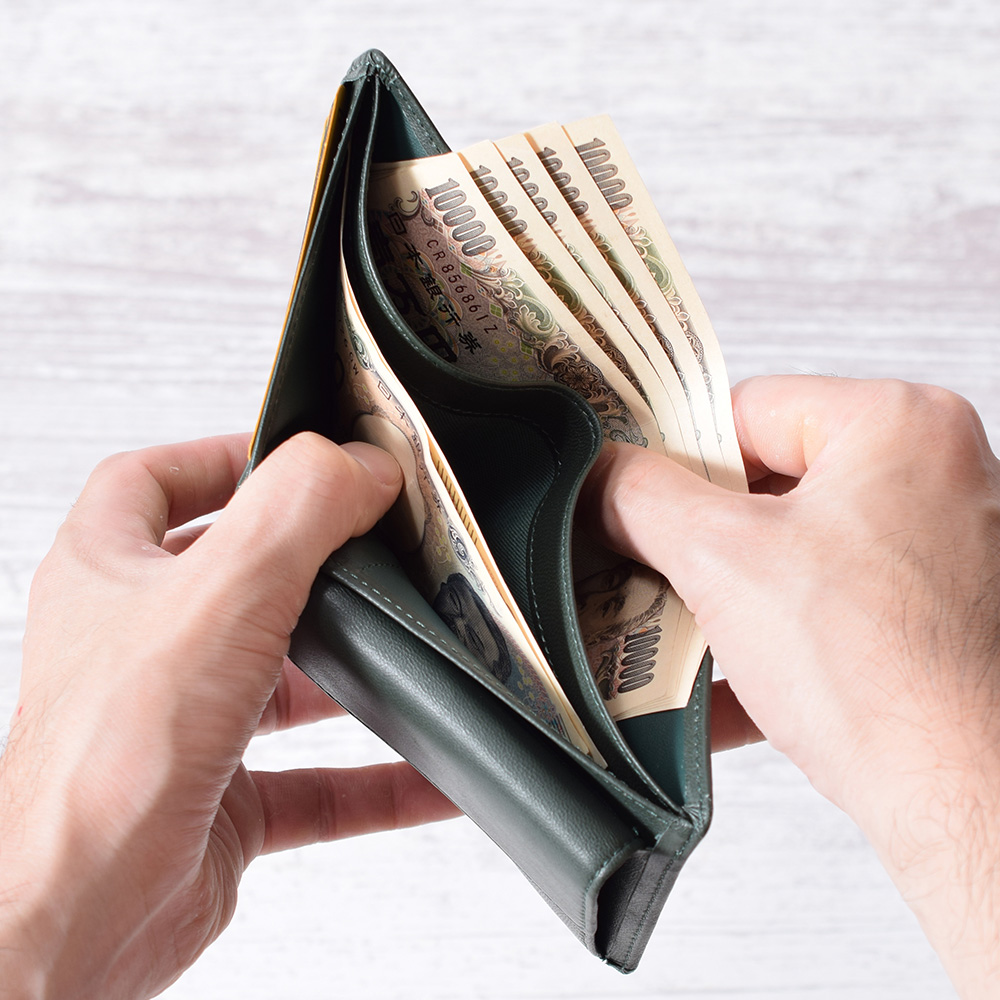 札入れ部分は2分割で1万円とその他の札、もしくは領収書などを分けて収納することが可能です。
