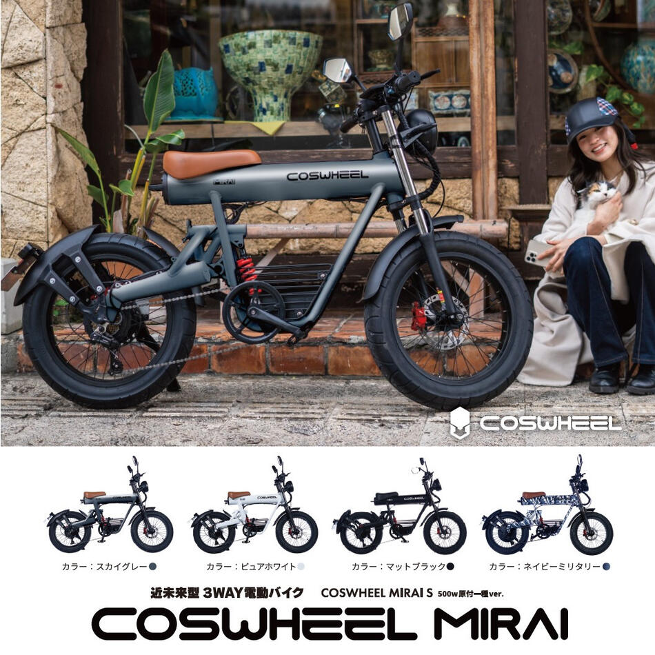 ●Point.1_超楽しい!原付が運転できる免許で公道走行可能!COSWHEEL MIRAI S1台で『電動バイク・ハイブリット・自転車』の3WAY乗りが楽しめます。自転車で馴染みのあるペダルに足を乗せる抜群の安定感、初めてバイクに乗る方へもおすすめです。