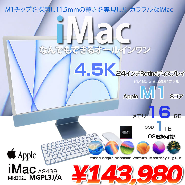 | 本体型番 | Apple iMac 24インチ Retina 4.5K MGPL3J/A Mid 2021 A2438 【ブルー】 |