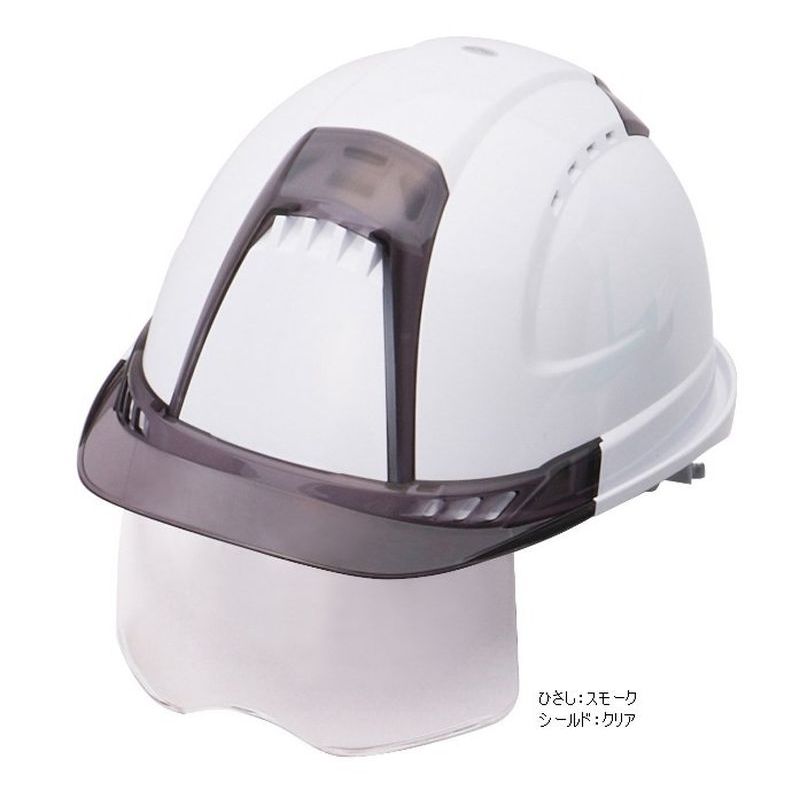 サイズ:53〜62cm 重量:約544g ひさし長さ:約33mm 帽体:白 ひさし・パネル色:スモーク シールドレンズ色:クリア 仕様:通気孔付き、スチロールライナー入り 用途:飛来・落下物用・墜落時保護用 帽体:熱可塑性ABS樹脂 レンズ:PC樹脂